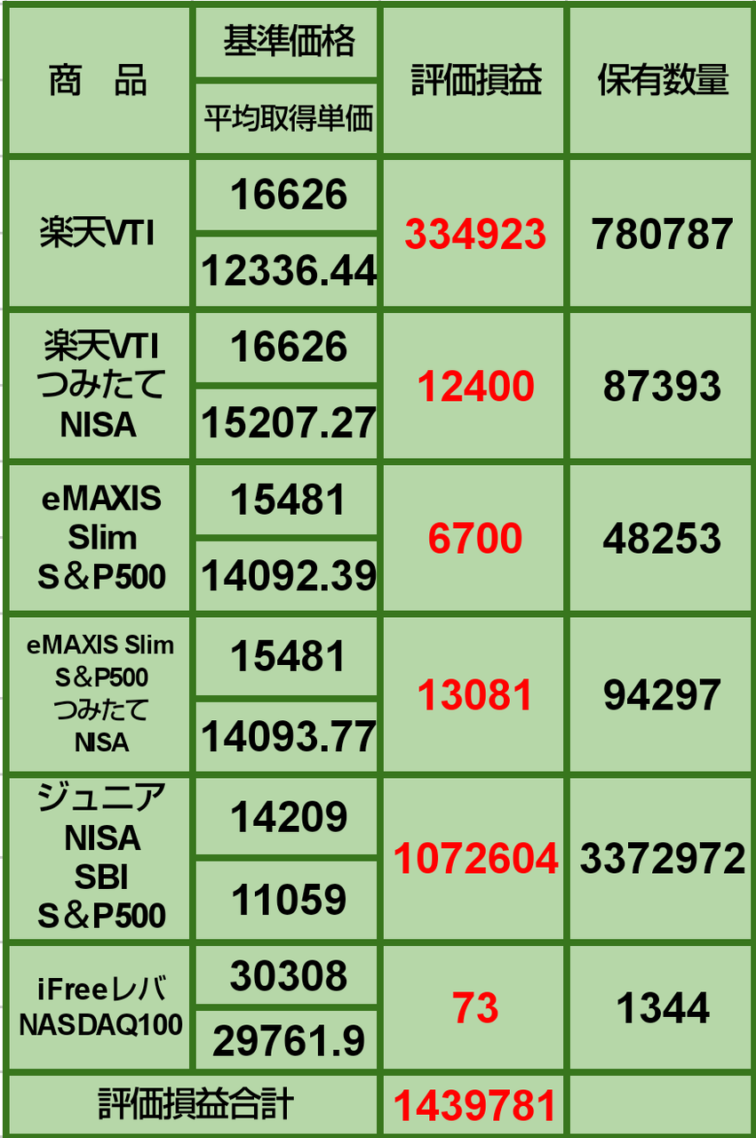 SBI・バンガード・S&P500の評価損益と保有数量は子供2人分です。