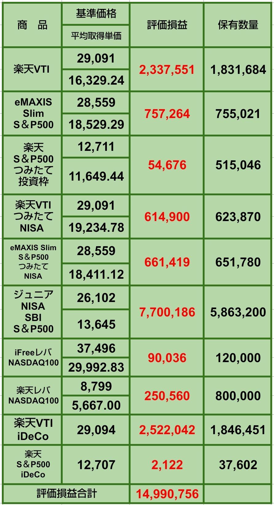 楽天・S&P500の評価益と保有数量は私と妻の2人分です。