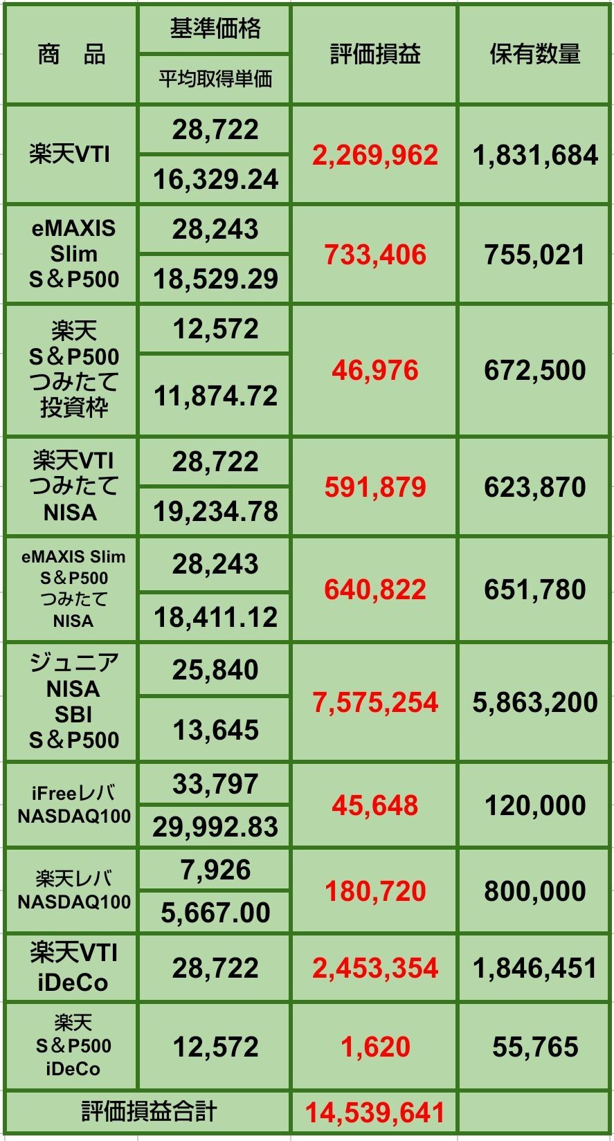 楽天・S&P500の評価益と保有数量は私と妻の2人分です。