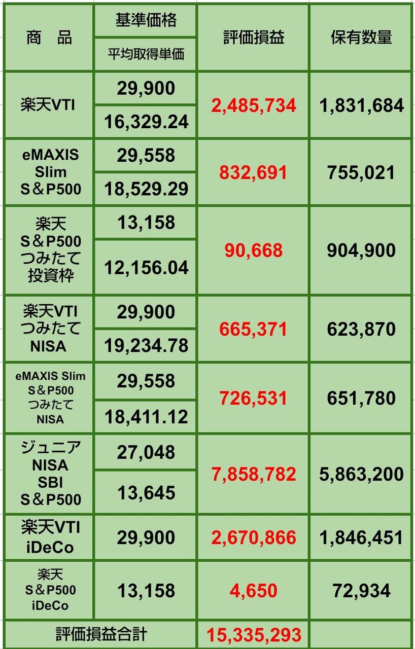 楽天・S&P500の評価益と保有数量は私と妻の2人分です。